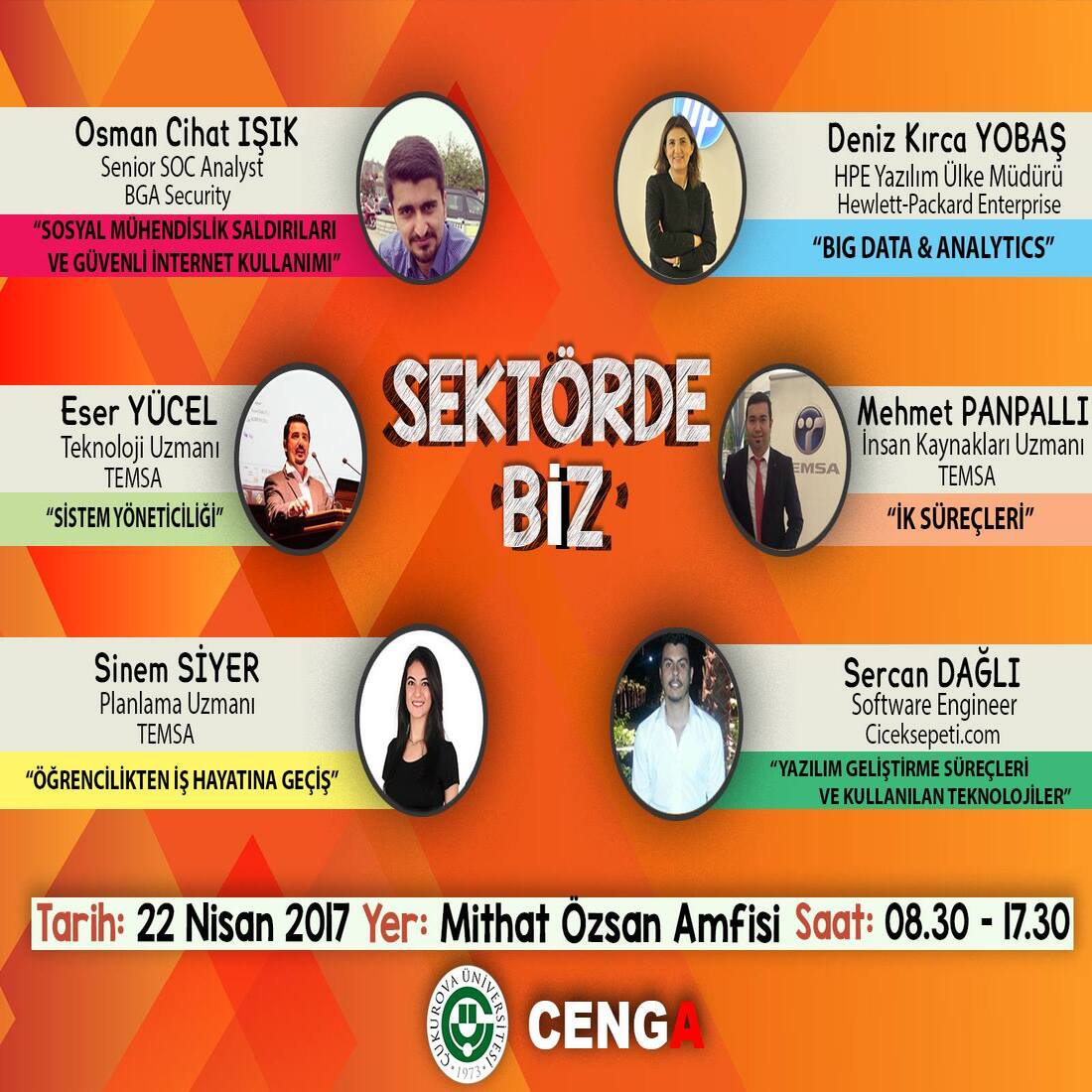 Eren Yıldız (Z Dijital), M. Erdal Sevinçer (SoftTech), Sedanur Erganiş (Sunar Grup), Mevlüt Soner (Göktekin Enerji), Ayşen Becit (TEMSA) ve Hamide Gümüşlü (Kekik Teknoloji) bizlerle olacak. Kariyer yolculukları ve network fırsatı için davetlisiniz!
