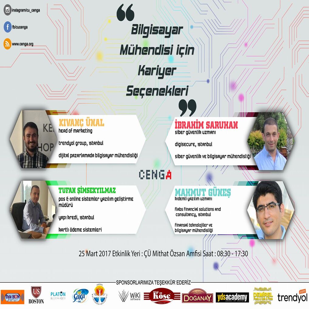Çukurova Üniversitesi Bilgisayar Mühendisliği ailesi ve CENGA iş birliği ile düzenlenen bu özel akşamda, mezunlarımız ve öğrencilerimiz bir araya geliyor!