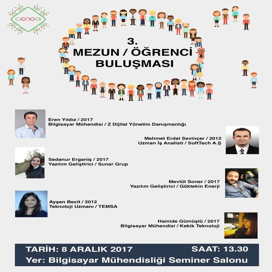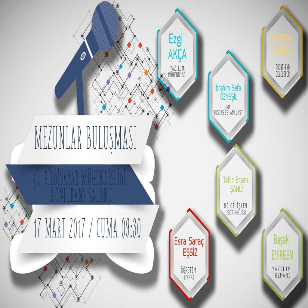 Çukurova Üniversitesi Bilgisayar Mühendisliği mezunlarımızı ve öğrencilerimizi bir araya getiren geleneksel “Mezunlar Buluşması” etkinliğimize davetlisiniz!Sektörün farklı dallarında ve akademik alanda tecrübe edinmiş değerli mezunlarımızın kariyer yolculuklarını dinlemek için bir araya geliyoruz. Konuklarımız; Ezgi Akça (Yazılım Mühendisi), İbrahim Sefa Özyeşil (CRM İş Analisti), Gencay Dağlı (Front-end Developer), Tahir Erşan Şanlı (Bilgi İşlem Sorumlusu), Esra Saraç Eşsiz (Öğretim Üyesi) ve Başak Evirgen (Yazılım Uzmanı) tecrübeleriyle bizlerle olacak.